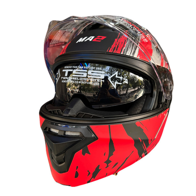 کلاه کاسکت های MA2 یکی از پر فروش ترین کاسکت های چند سال اخیر بوده است . این برند از کیفیت قابل قبولی نزد مشتریانش بهره میبرد . پوسته روی کلاه از جنس ABS است و به خوبی در برابر ضربات و صدمات ناشی از تصادفات از سر و گردن شما محافظت خواهد کرد . رنگ روی کلاه مقاومت بسیار زیادی در برابر اشعه خورشید دارد و اگر شما تا به حال از کاسکت های MA2 استفاده کرده باشید میبینید حتی پس از چند سال استفاده مستمر رنگ روی کلاه از بین نخواهد رفت . یکی از نقاط قوت این مدل تو دوزی و آستر های داخلی آن است که بسیار دوخت ظریف و با کیفیتی دارد و شاید اولین چیزی که بعد از دیدن کلاه خود نمایی میکند همین پدها و پارچه های داخل کلاه است . پد های داخل تماما قابل شست شو و تعویض هستند . ضمنا این مدل دارای پد گردن میباشد که مانع از نفوذ باد به داخل کلاه میشود و کلاه کاملا کیپ خواهد بود (توجه داشته باشید سایز مناسب را از راهنمای سایز موجود انتخاب نمایید و این را در نظر داشته باشید که کلاه حتما کیپ صورت شما باشد و نباید روی سر بازی داشته باشد) .این کلاه دارای سه هواکش در جلو و 2 هواکش در عقب کلاه است و این باعث خواهد شد سر شما در مسافت های طولانی کمتر عرق کند . عینک UV و طلق 100% پلی کربنات ضد خش دید بسیار شفاف را برای شما به همراه خواهد داشت. قابلیت نصب بلوتوث برای کلاه کاملا مهیاست و شما با برداشتن پد های گوش که به صورت دکمه ای به پوسته کلاه متصل هستند میتوانید اسپیکر های بلوتوث را به راحتی در جای خود بچسبانید و سپس پد ها را در جای خود قرار دهید. ضمنا یک کاور پارچه ای مخصوص حمل کلاه نیز به همراه کلاه موجود است.